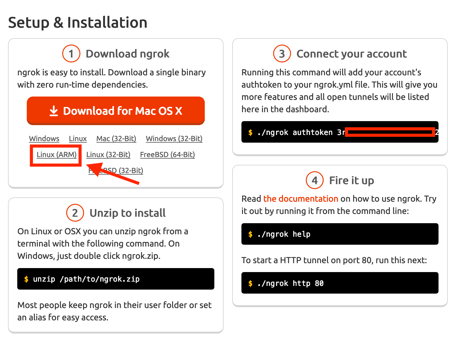 Go to ngrok.com to register account, then download ngrok (Linux ARM) version.
