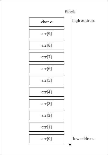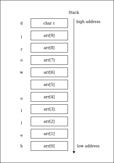 So technically we still have 11 slots, but the last one is not for our array, it is the space for our variable c. When the program saved the whole string, it put the last letter ‘d’ in our char c slot - that’s why after input our varaible c has been modified to d ! This kind bug is quite dangerous and not easy to find!