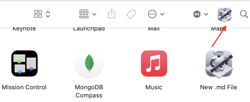 3, Click “File > Save”, name it “New .md File”, and save it to “/Applications” folder 4, Open your applications folder, find the “New .md File” app, hold the cmd key and drag the app to “Finder”‘s toolbar: